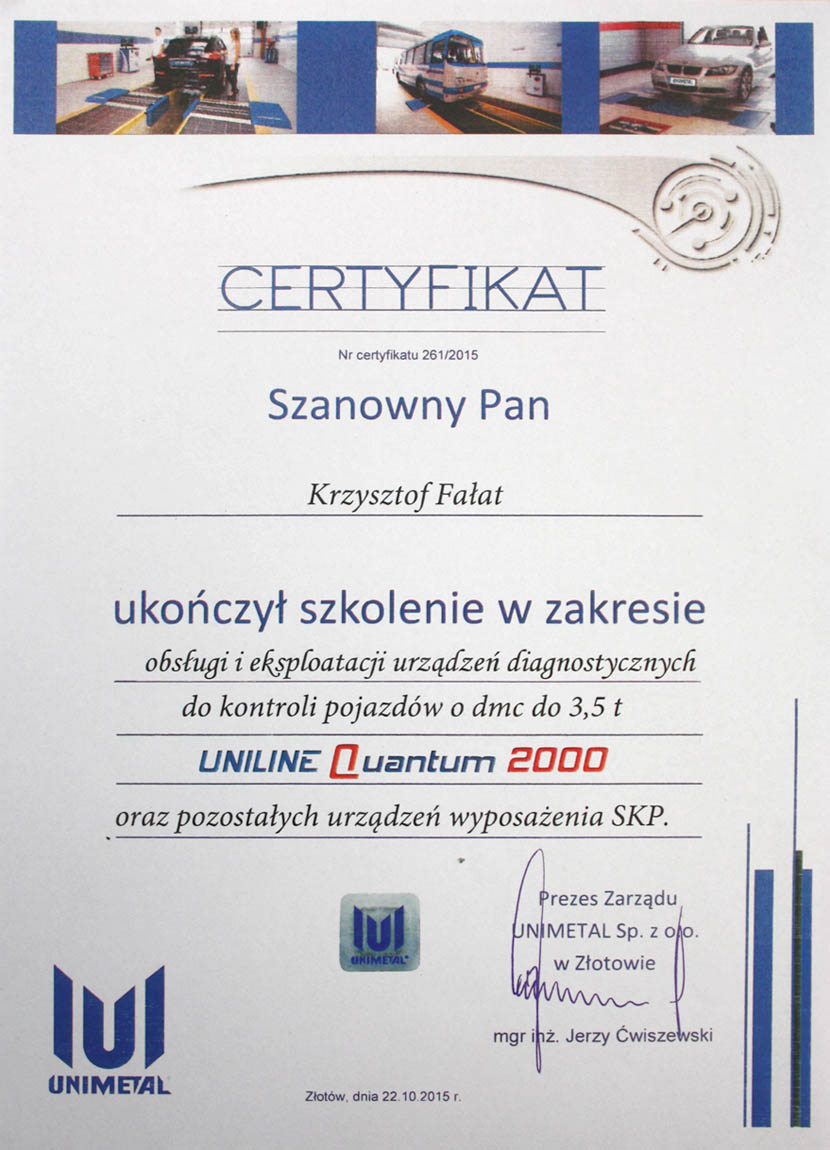 O Państwa samochód zadba nasz wykwalifikowany diagnosta Krzysztof Fałat, mogący się pochwalić licznymi certyfikatami potwierdzającymi jego profesjonalizm: